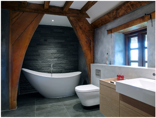 Modern meets rustic in this unique character bathroom. Cool concrete walls and ceramic fixtures are offset by an irregular, artistic oak archway, which beautifully frames a basalt feature wall.