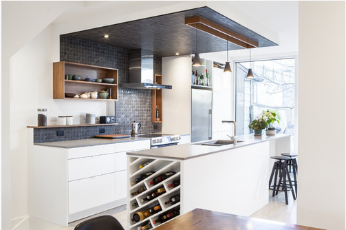 This Canadian kitchen's splashback stands out for two reasons: The first, it's unique folding up across the ceiling. The second, the outstanding contrast between a largely white kitchen and the moodiness and texture of basalt tiles.