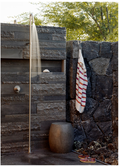 The mixtures of textures creates visual intrigue, while also defining the space clearly – separating the shower from the rough stone fence to its side.