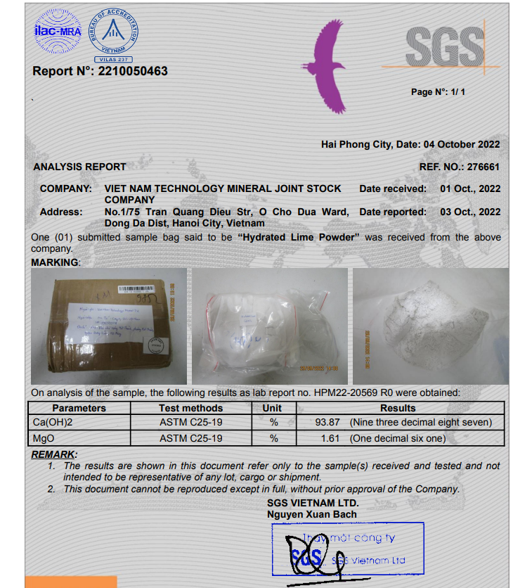 | 1 | Total Ca(OH)2 | % | 92 MIN | TCVN9191:2012 |