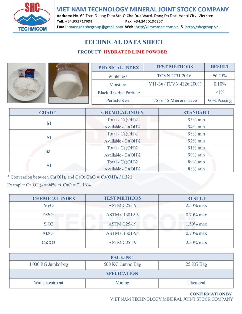 High Ca(OH)₂ purity (90–96%) – consistent and low in Fe₂O₃, SiO₂, MgO impurities.
