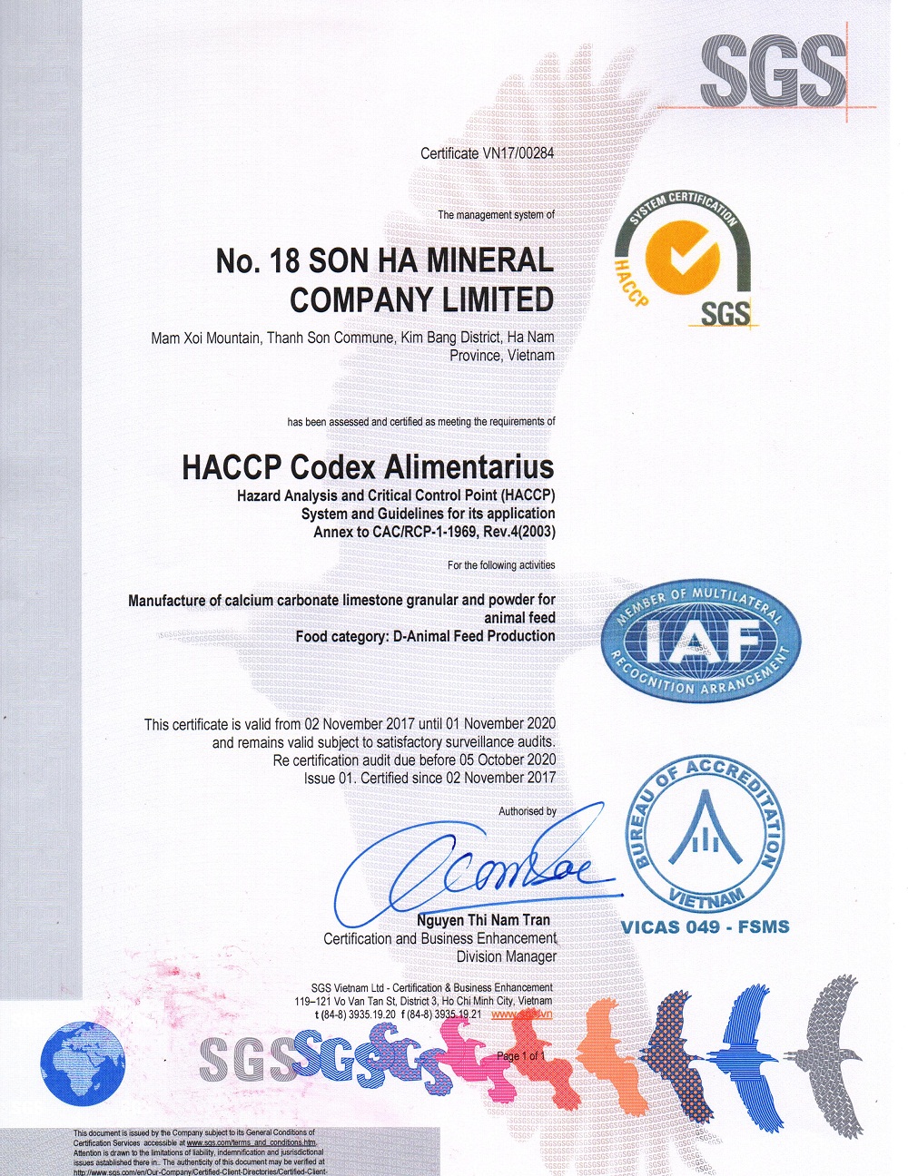 Also No.18 Son Ha Minerals Company Limited has been assessed and certified as meeting the requirements of ISO 22000:2005 and HACCP for the following activities manufacture of calcium carbonate limestone granular and powder for animal feed. Food category: D-Animal Feed Production.
